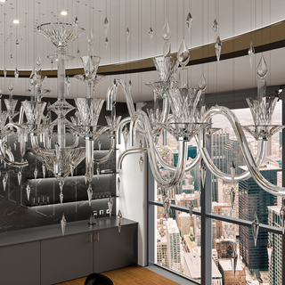 The Illusion crystal lighting fixture masterfully combines the traditional elegance of a classic chandelier with an innovative modern design. Its unique suspension makes it possible to create endless variations and adaptations of the classic style in a contemporary concept.